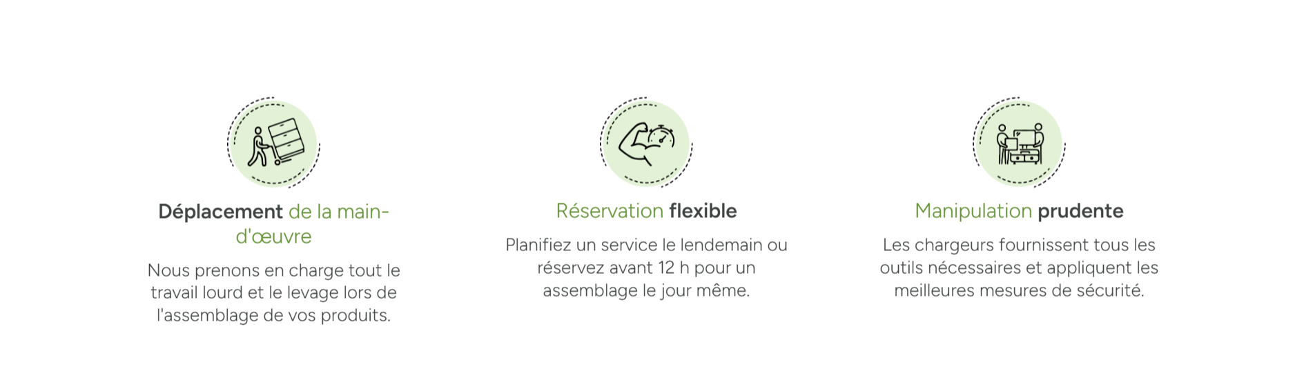 Lors de votre réservation en ligne , commencez par sélectionner les articles à assembler . Vous aurez ensuite la possibilité d’ajouter des services d’enlèvement et de collecte à votre commande. Pour les articles à emporter, nos chargeurs les enlèveront au moment de l’assemblage prévu. Plus vous ajoutez d’articles à votre commande, plus vous économisez !